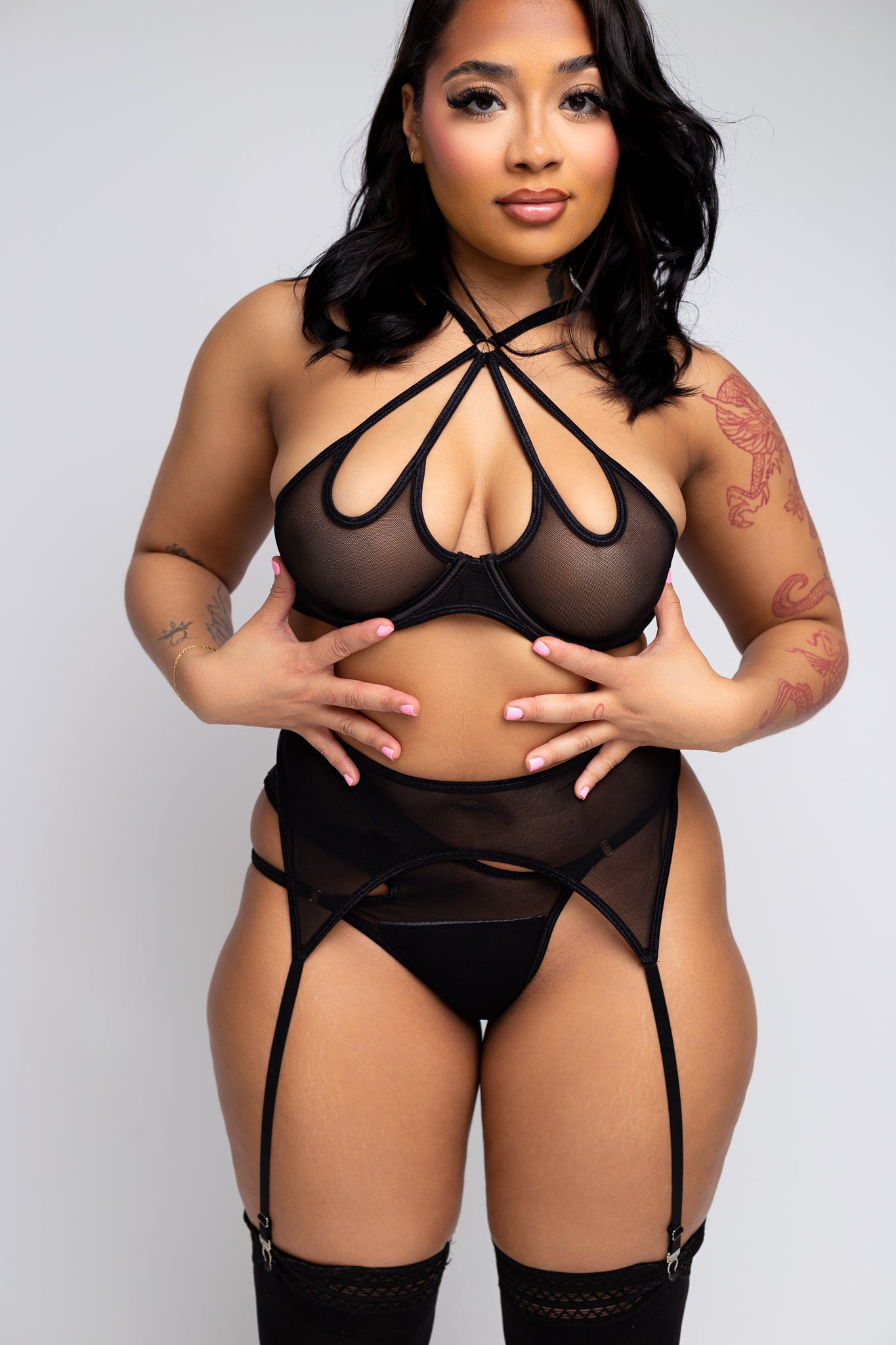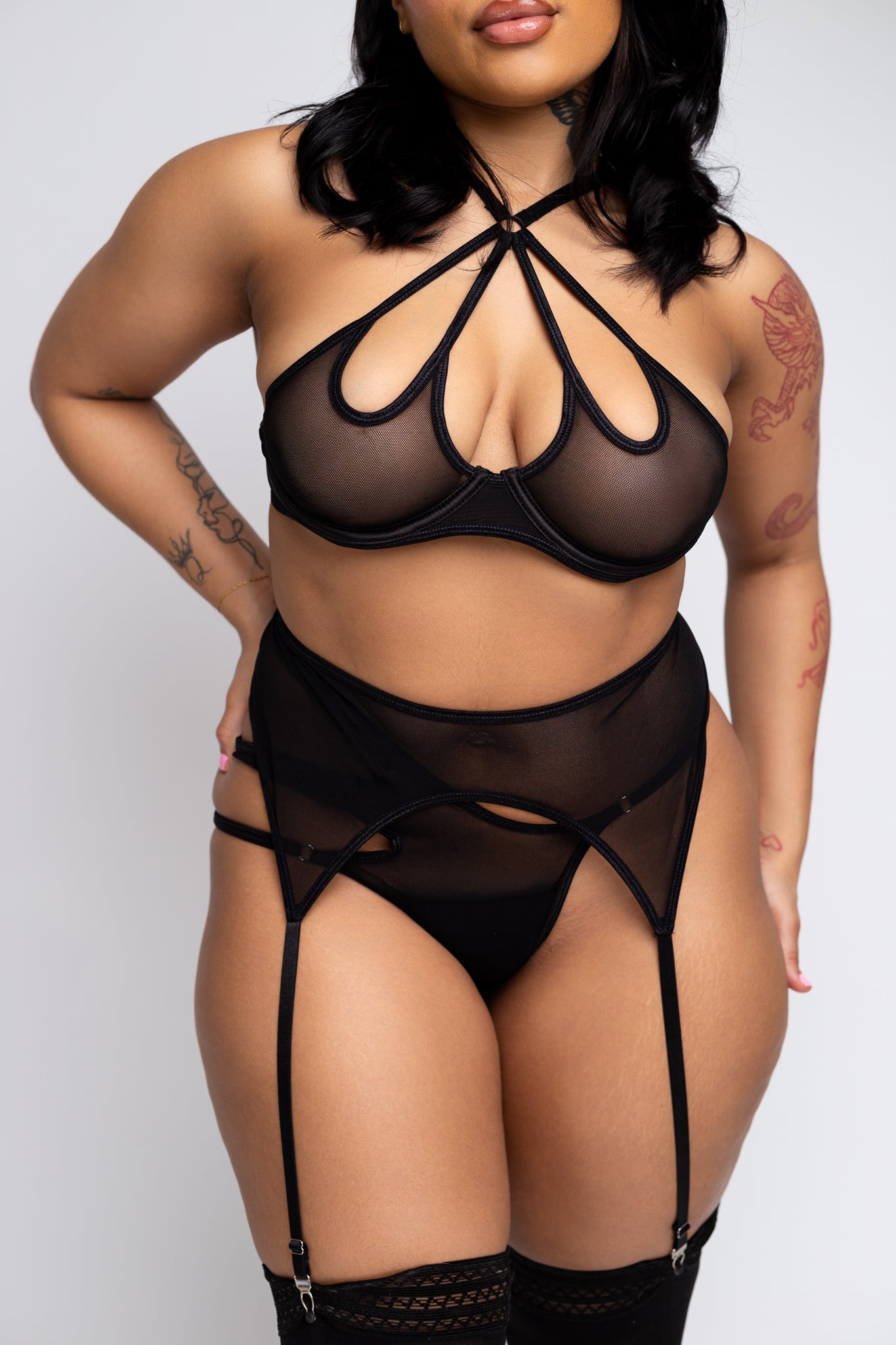 3-piece sheer mesh halterneck bra and garter belt and matching panty set with butterfly style cutouts and strappy detail.