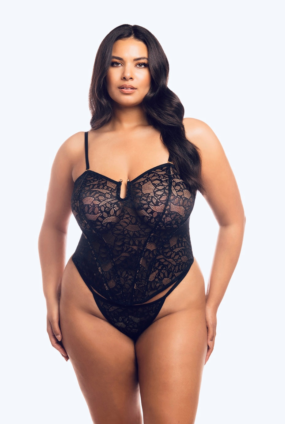 SNAKE ALLOVER LACE BUSTIER WITH BONING INSERTS AND MATCHING G-STRING PANTY.